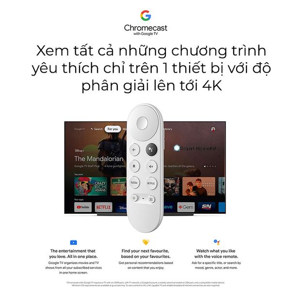 Hệ điều hành Google TV: Chromecast with Google TV 4K được tích hợp sẵn hệ điều hành Google TV, mang đến giao diện người dùng thân thiện và dễ sử dụng. Bạn có thể dễ dàng tìm kiếm và khám phá nội dung từ hàng nghìn ứng dụng và dịch vụ trực tuyến, đồng thời nhận được các gợi ý cá nhân dựa trên sở thích của bạn.