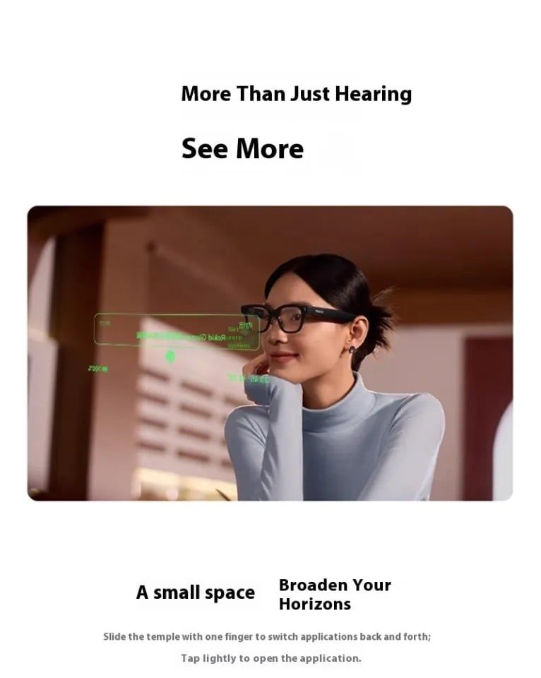 Màn hình hiên thị đơn sắc trên 2 mắt kính. Hiển thị phụ đề dịch thuật, chỉ đường…